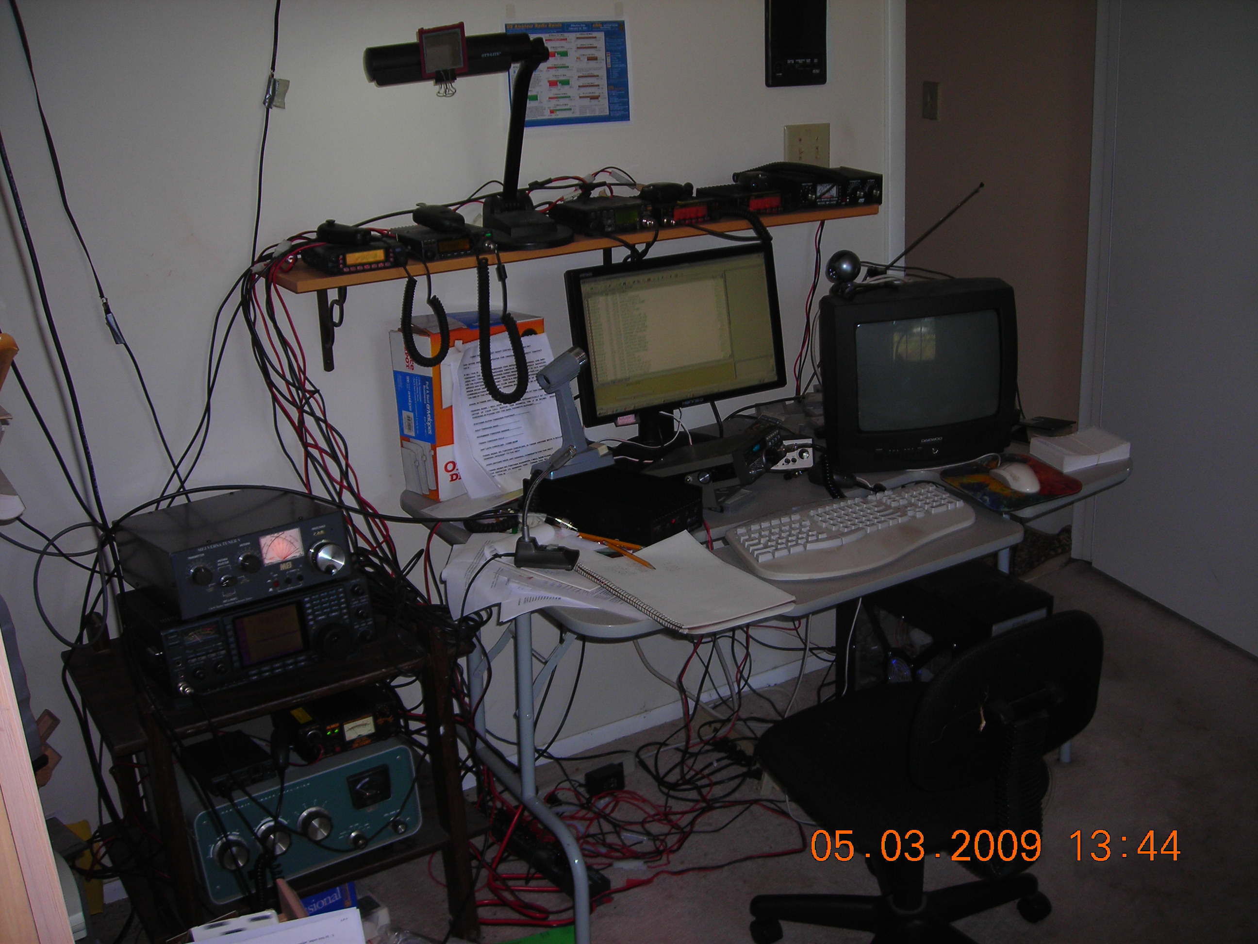 From left to right: A FT7800 tuned to the 88 or 444, an AR-247 I bought for repeater control but I use it on Ray's 224.5 repeater, next is an old IC-28H I have had forver and now its the Echolink transceiver and I hear the 37 through the computer speakers, following that radio is a DR1335 I bought to use for IRLP before we abandonded that project and it monitors the 94 repeater and last is a DR06 I use on the 53.07 repeater